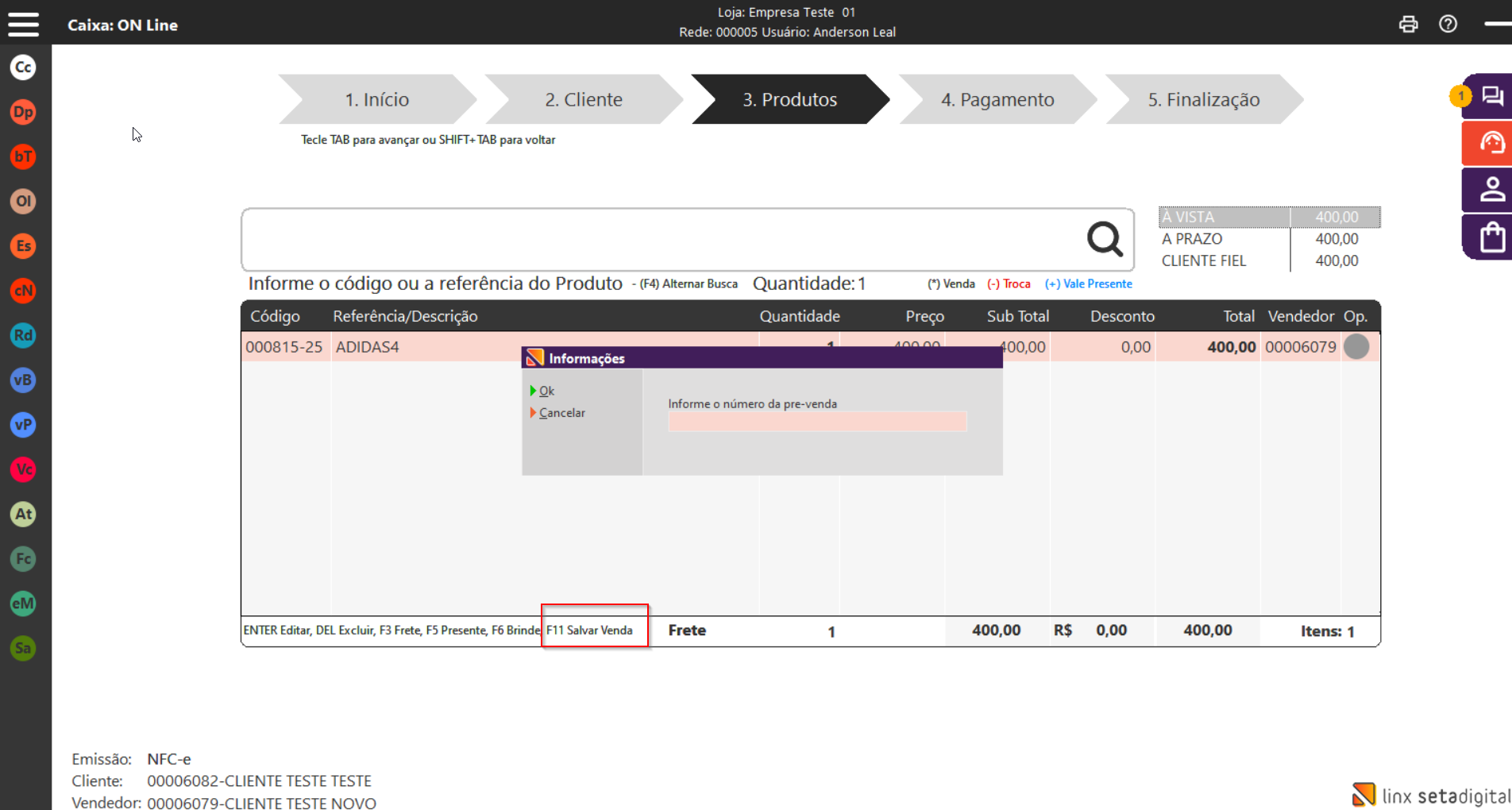 Salvamento da venda como pré-venda, armazenando: