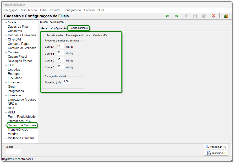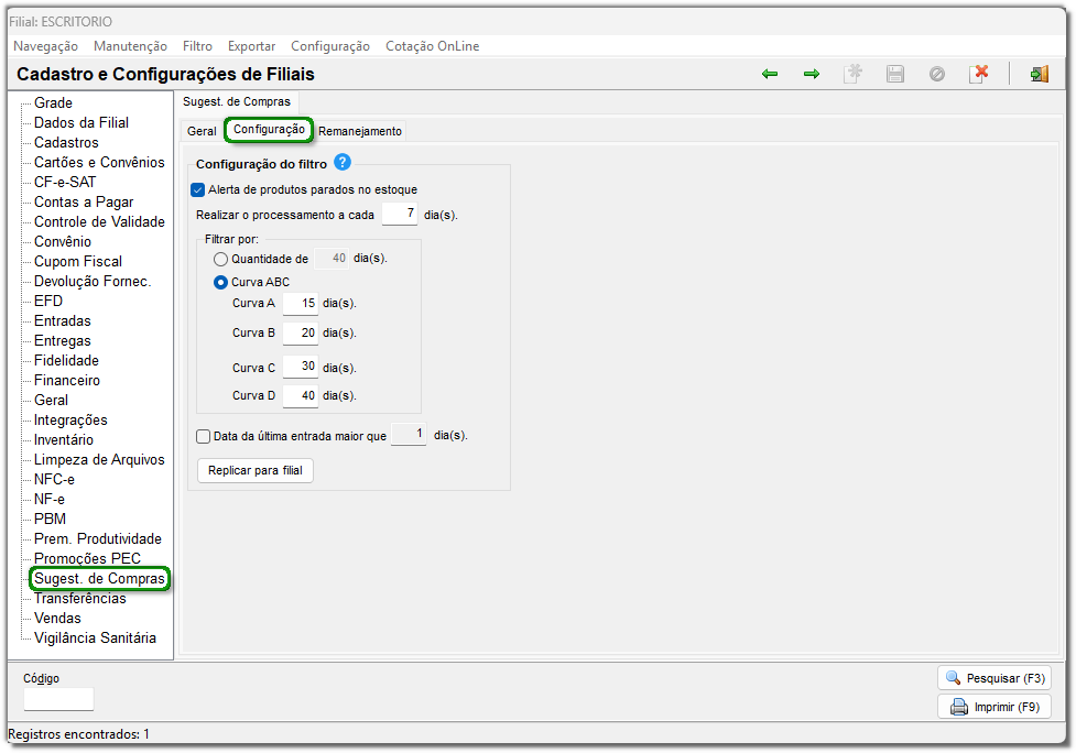 3. Acesse o menu 'Configurações > Filiais > Sugestão de compras > subaba Configuração';
