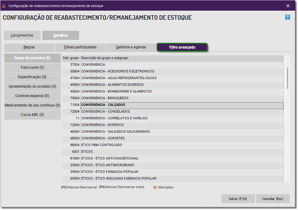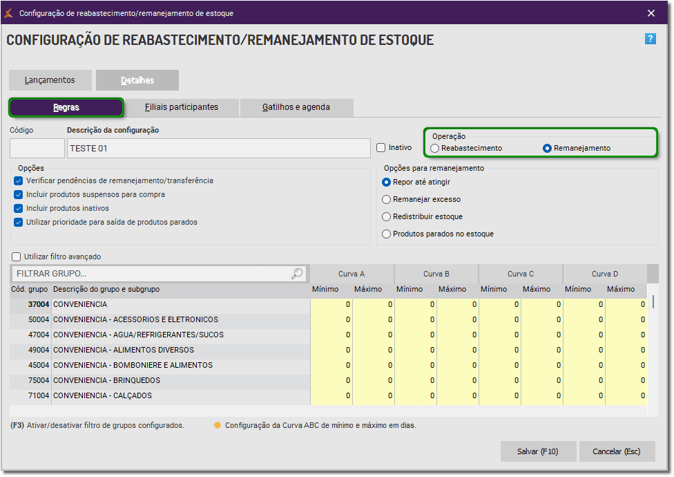 2. Será aberta a tela de 'Configuração de Reabastecimento/Remanejamento de Estoque';