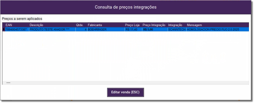 4. Será exibida a tela de consulta de preços de cada integração;
