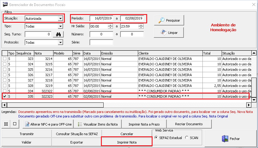 * Após localizar a NFCe ou SAT basta selecionar e em seguida selecionar Imprimir Nota;