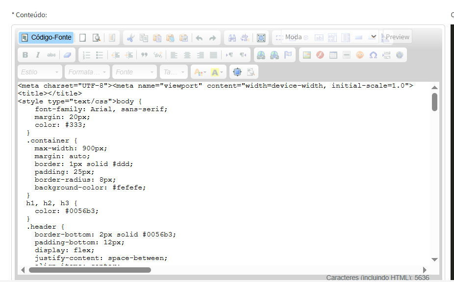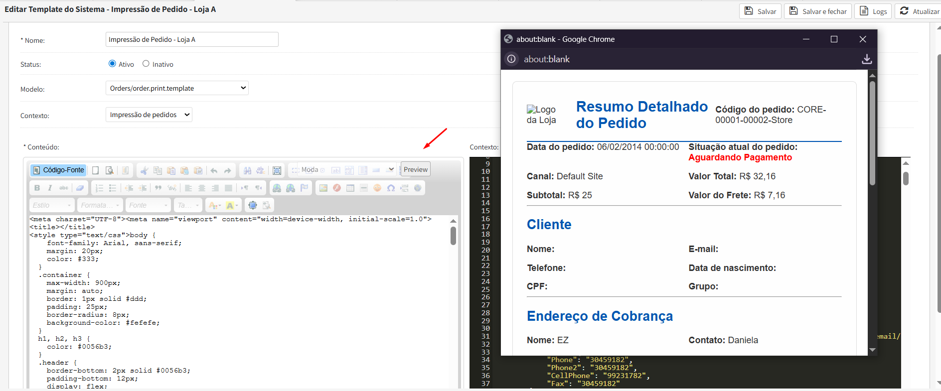 - No editor, o campo Conteúdo é o campo que de fato vai representar o corpo do template de impressão de pedido.