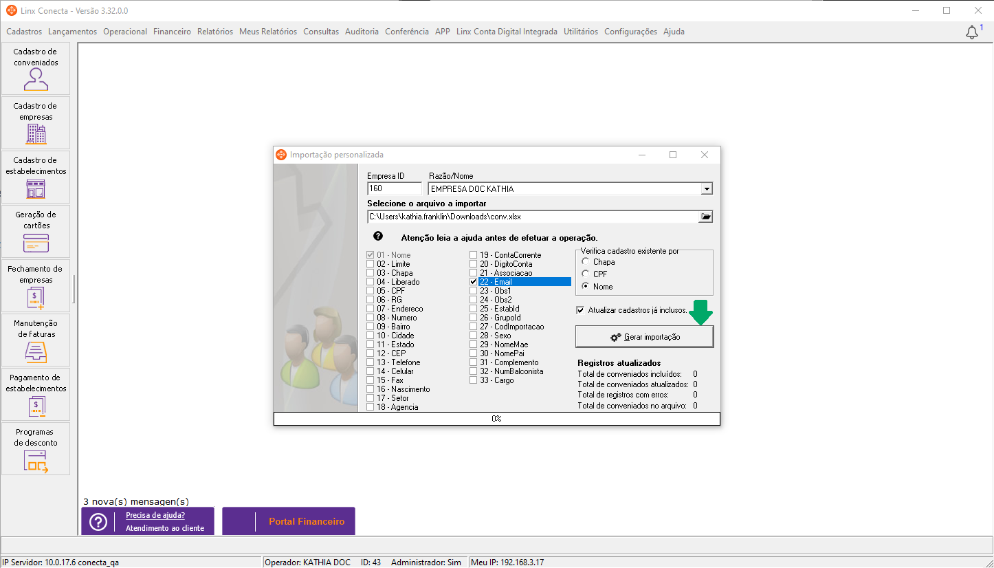 Para realizar a atualização em massa dos e-mails do conveniados, siga os passos abaixo: