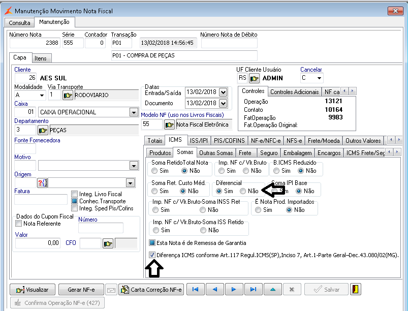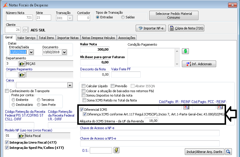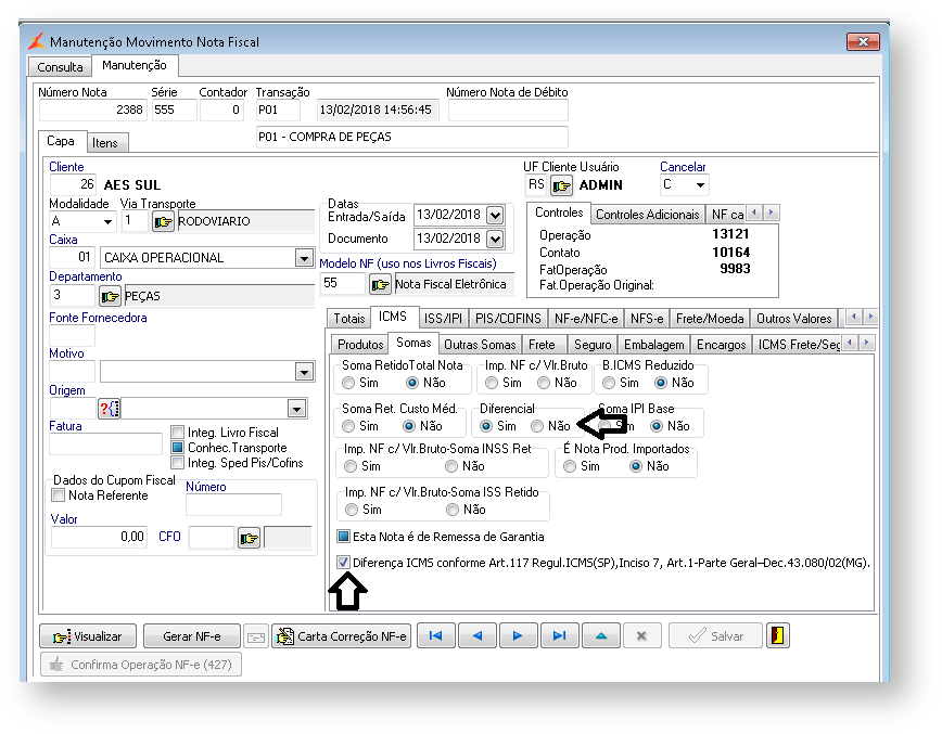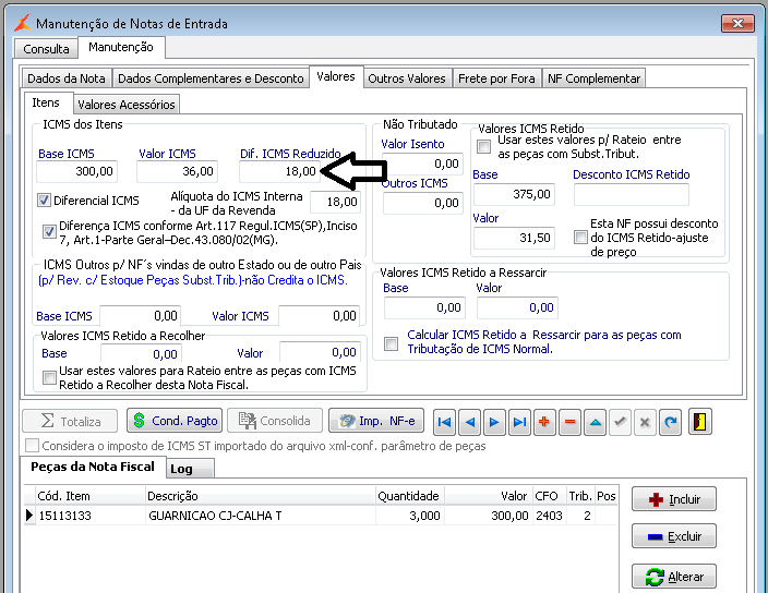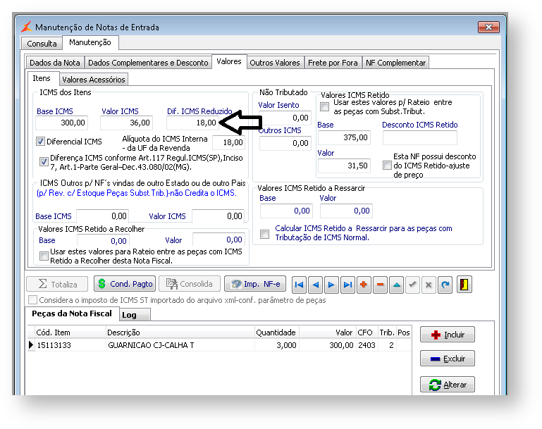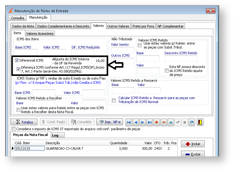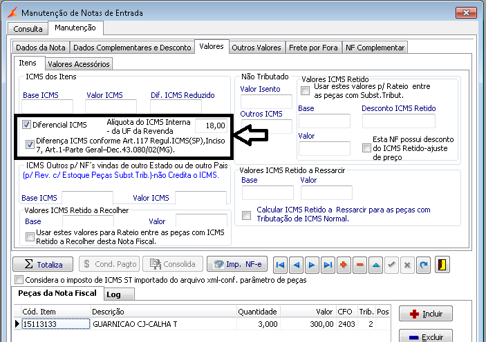 - Diferencial ICMS, que deve ser marcado quando for para ser calculado o valor Diferencial do ICMS Reduzido na nota de entrada de peças.