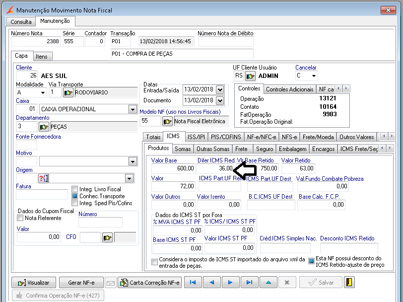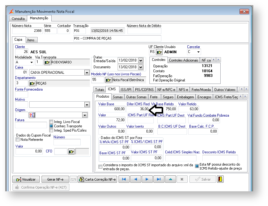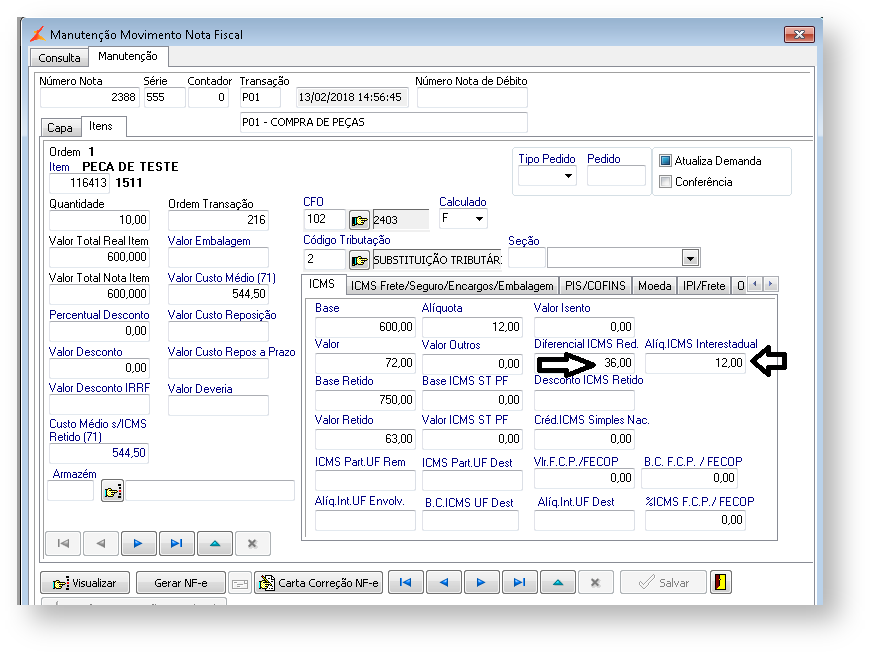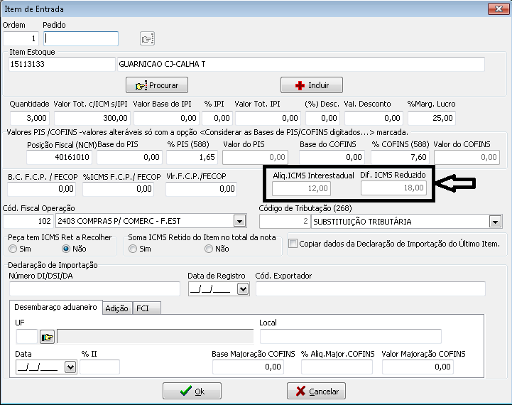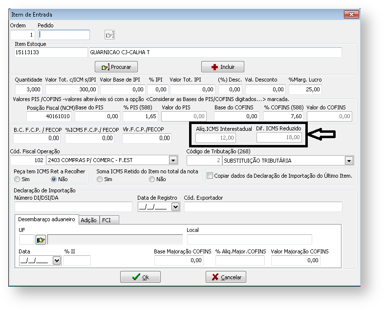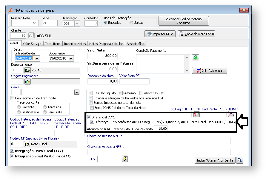 - Diferencial ICMS, que deve ser marcado quando for para ser calculado o valor Diferencial do ICMS Reduzido na nota de entrada de peças.