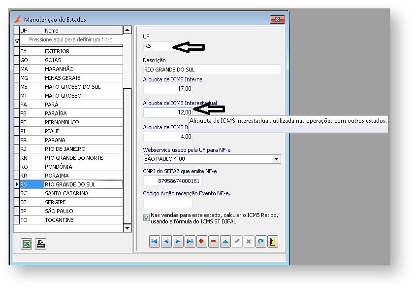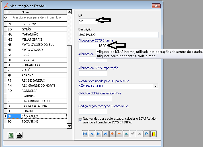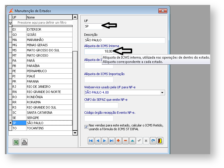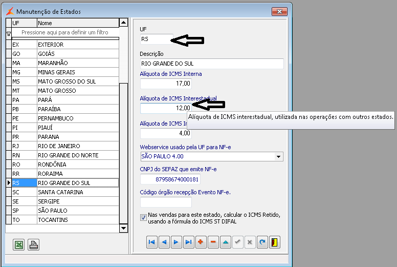 - Alíquota do ICMS Interna - da UF da Revenda, para onde será trazida a alíquota interna da UF da revenda, informada no cadastro dos estados, conforme mostra a imagem acima.