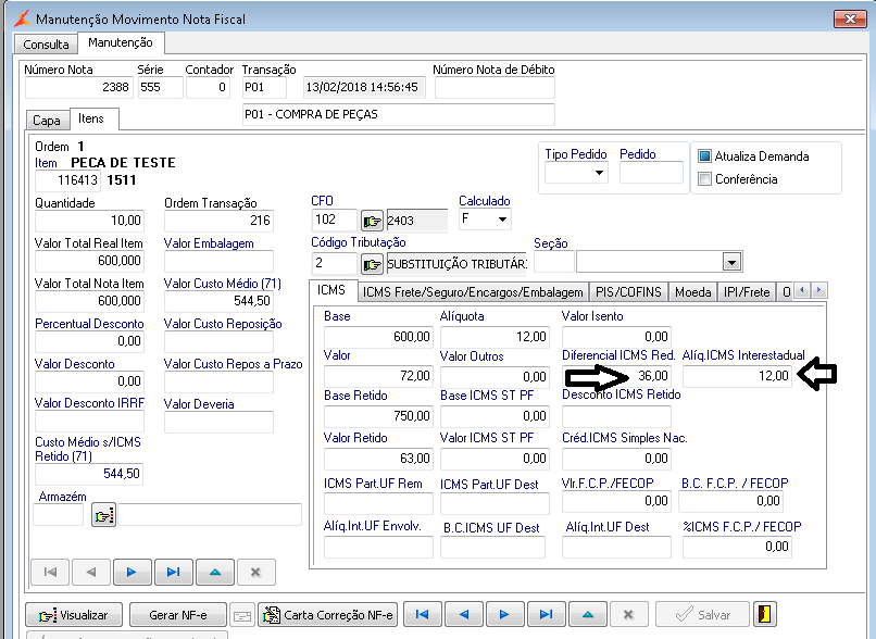 Processo para que no recebimento de peças seja calculado o diferencial de ICMS, da mesma forma que já existe na geração da nota fiscal de despesas, aplicando as mesmas fórmulas, conforme as UF´s das revendas.