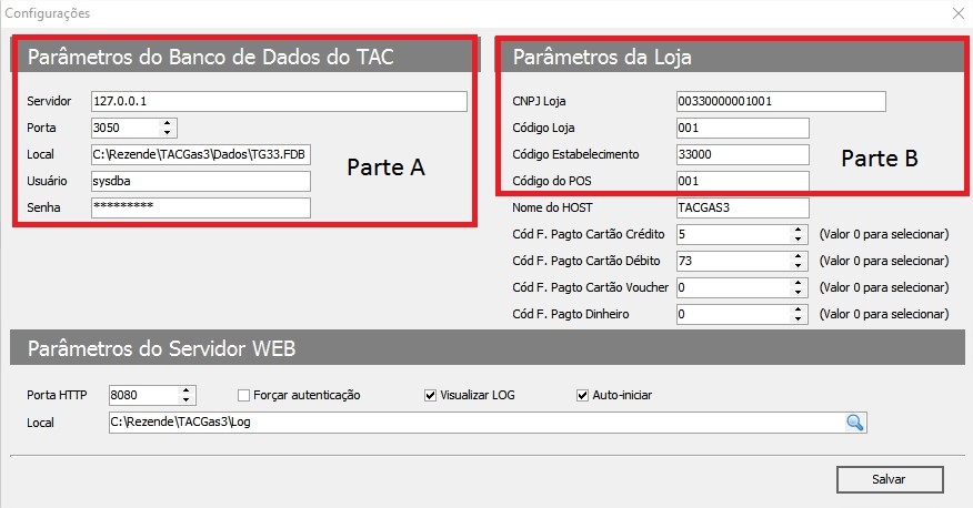 Configuradas as Formas de Pagamento é preciso configurar o WS Auttar para que haja conexão e envio de informações para o CTFClient, para isso abra o aplicativo WS que fica dentro da pasta do PDV, clique em Parar e o botão das configurações será habilitado, clique em Configurações, será aberta na sequência uma tela para informar os dados de parametrização do banco de dados do PDV e dos parâmetros da loja.  Preencha as informações solicitadas referente as parametrizações do PDV, como servidor, porta, local onde está a base de dados do PDV usuário e senha referentes ao banco de dados do PDV, descritas no exemplo como parte A.