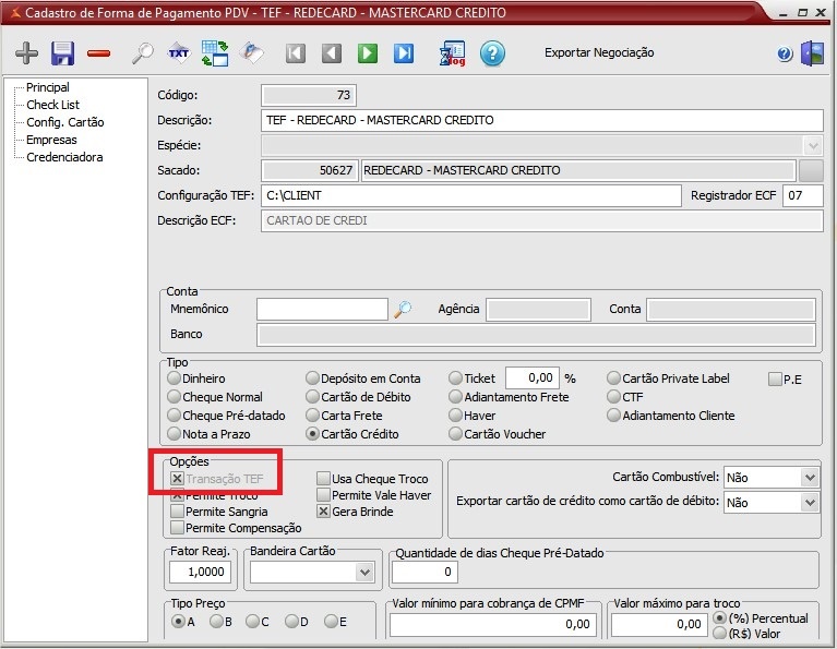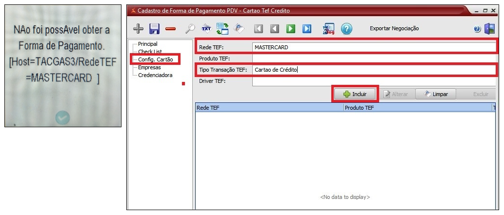 Em seguida vá até a aba Conf. Cartão, no campo Rede TEF é necessário que seja informada uma descrição, essa descrição, deve ser a mesma que o POS Auttar informar quando uma transação for executada e o mesmo verificar que não foi possível obter a forma de pagamento MASTERCARD utilizada como exemplo, isso porque o POS irá verificar as informações cadastradas na aba Conf. Cartão da tela Forma de Pagamento. Em seguida, informe o Tipo Transação TEF desejada, feito isso clique em Incluir, logo após salve as alterações feitas e em seguida exporte para o PDV desejado a opção Forma de Pagamento.
