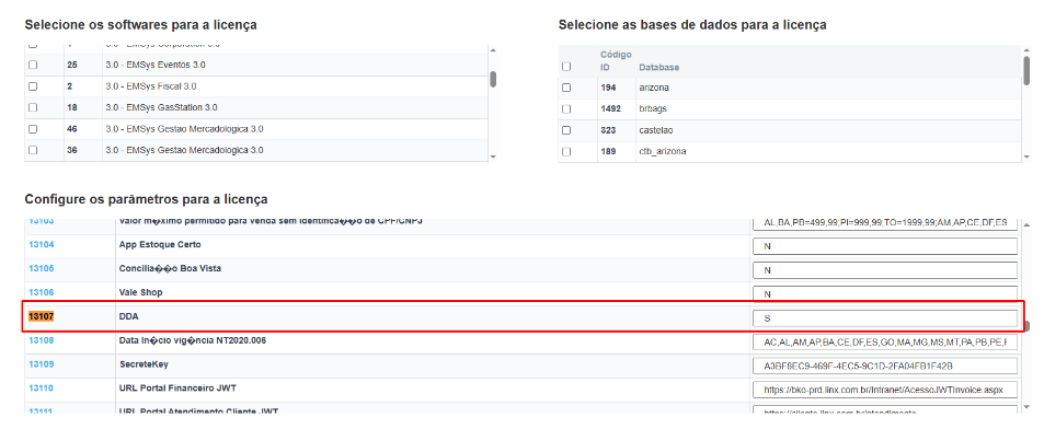 Antes de utilizar a tela de Débito Direto Autorizado, é necessário habilitar o parâmetro 13107 na Licença.