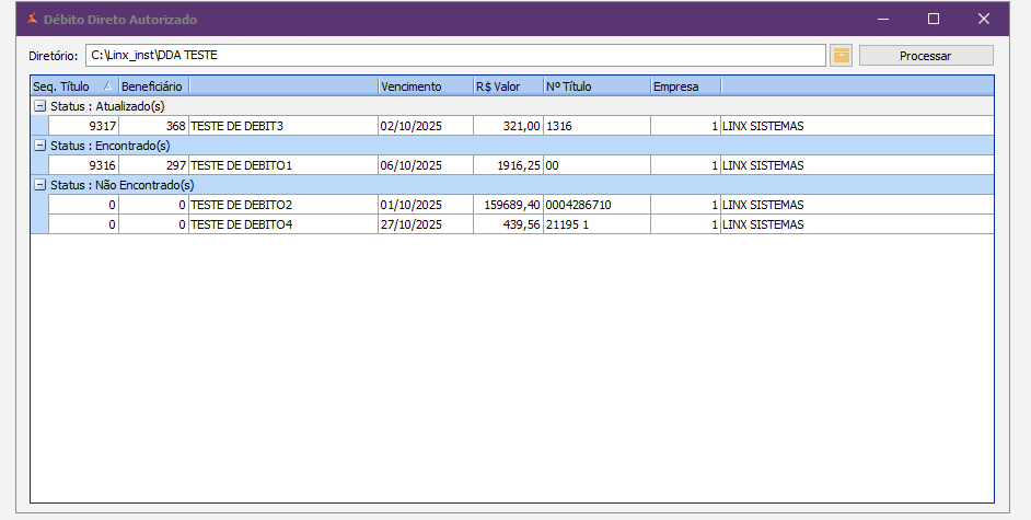 O sistema poderá retornar uma das seguintes situações para cada título processado: