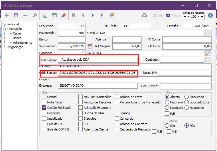 Após a leitura do arquivo .RET, o sistema utilizará os dados extraídos para localizar os títulos a pagar correspondentes. A validação é feita com base nas seguintes informações:
