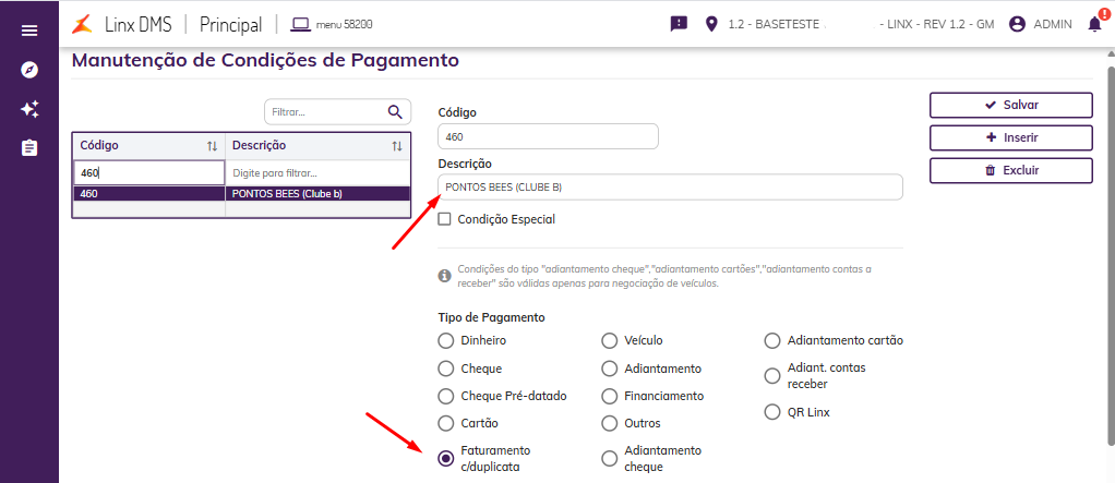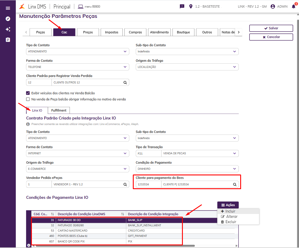 Na aba CAC, relacionar as condições de pagamento já utilizadas na concessionária com as condições da BEES: