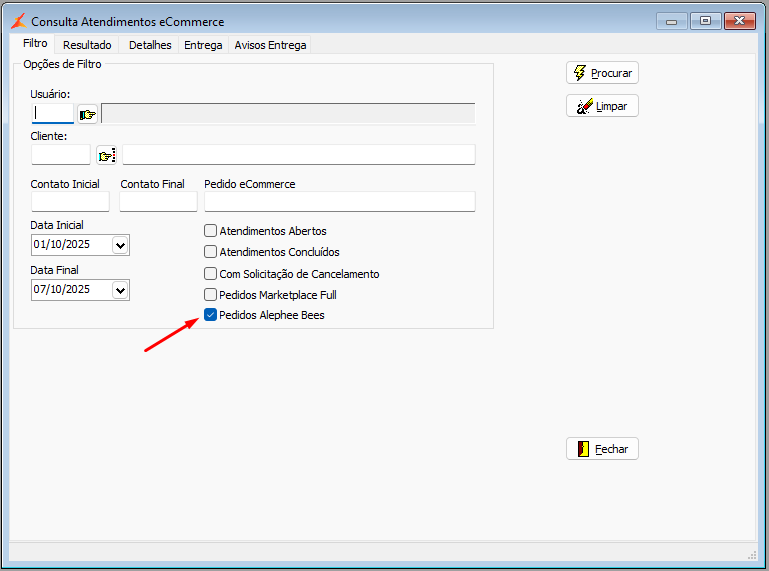 Foi implementado um novo filtro dedicado para essa pesquisa "Pedidos Alephee Bees", simplificando a localização dos pedidos.