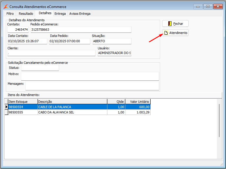 Uma vez localizado o pedido, o fluxo se mantem o mesmo para o eCommerce no "Atendimento Balcão", onde ao selecionar o pedido com duplo clique, é levado para seus detalhes e ali, clique no botão "Atendimento" que por sua vez levará para tela de "Atendimento Balcão":
