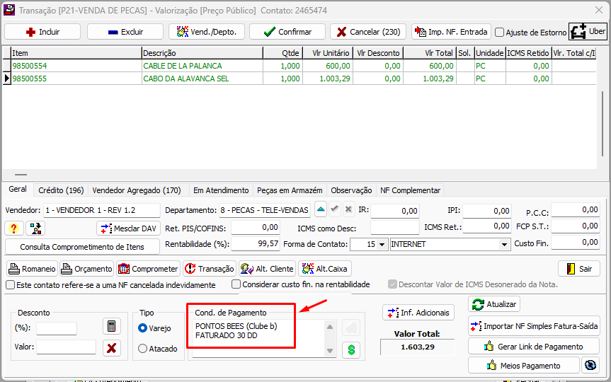 O objetivo principal desta integração com a BEES, é a possibilidade do uso de múltiplas condições de pagamento para o mesmo pedido/atendimento, estas condições sendo originadas do sistema BEES, como no exemplo acima.