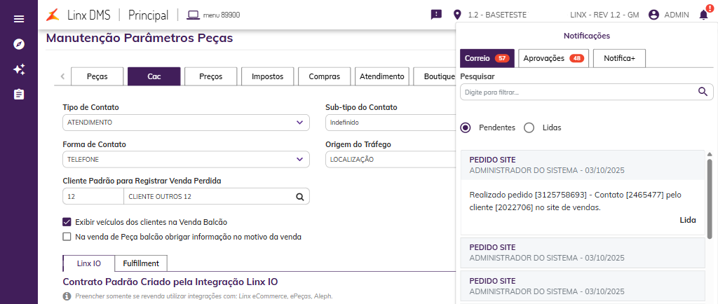 Quando os pedidos forem da BEES, o disparo desta notificação será imediato após a importação do mesmo, a notificação será via correio interno do LinxDMS: