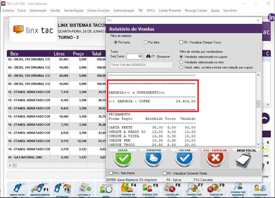 Quando o operador optar por realizar a sangria manual, o mesmo deverá selecionar a forma de pagamento sangria devida, conforme a operação que será realizada. EX: Sangria – Cofre / Dinheiro(sangria manual).