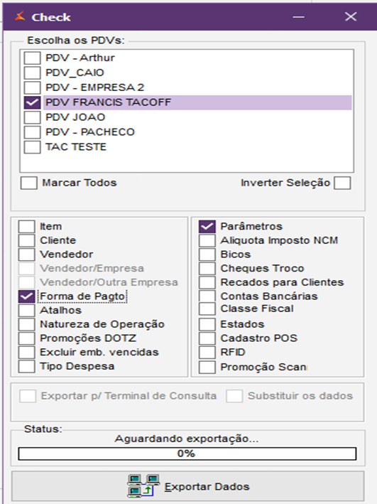 Exportar configuração para o TAC, habilitando as opção PDV + Parâmetros + Forma de Pagamento.