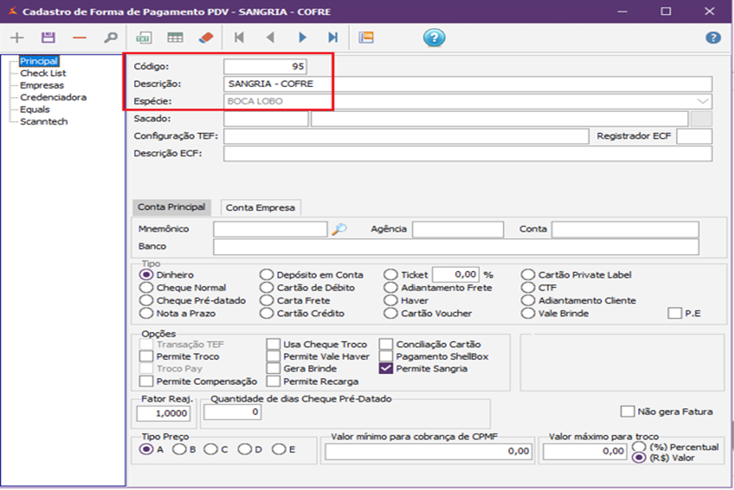 Cadastrar uma forma de pagamento Sangria diferente da existente no banco de dados, pois no relatório de fita de fechamento de caixa, os valores serão exibidos separadamente entre sangrias do cofre e sangrias convencionais(manuais).