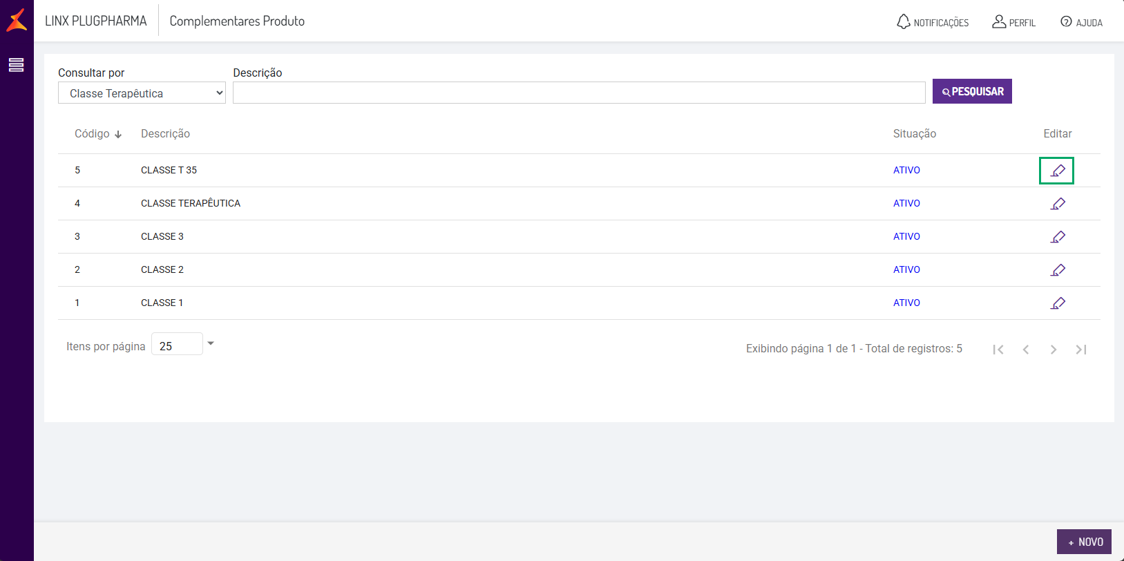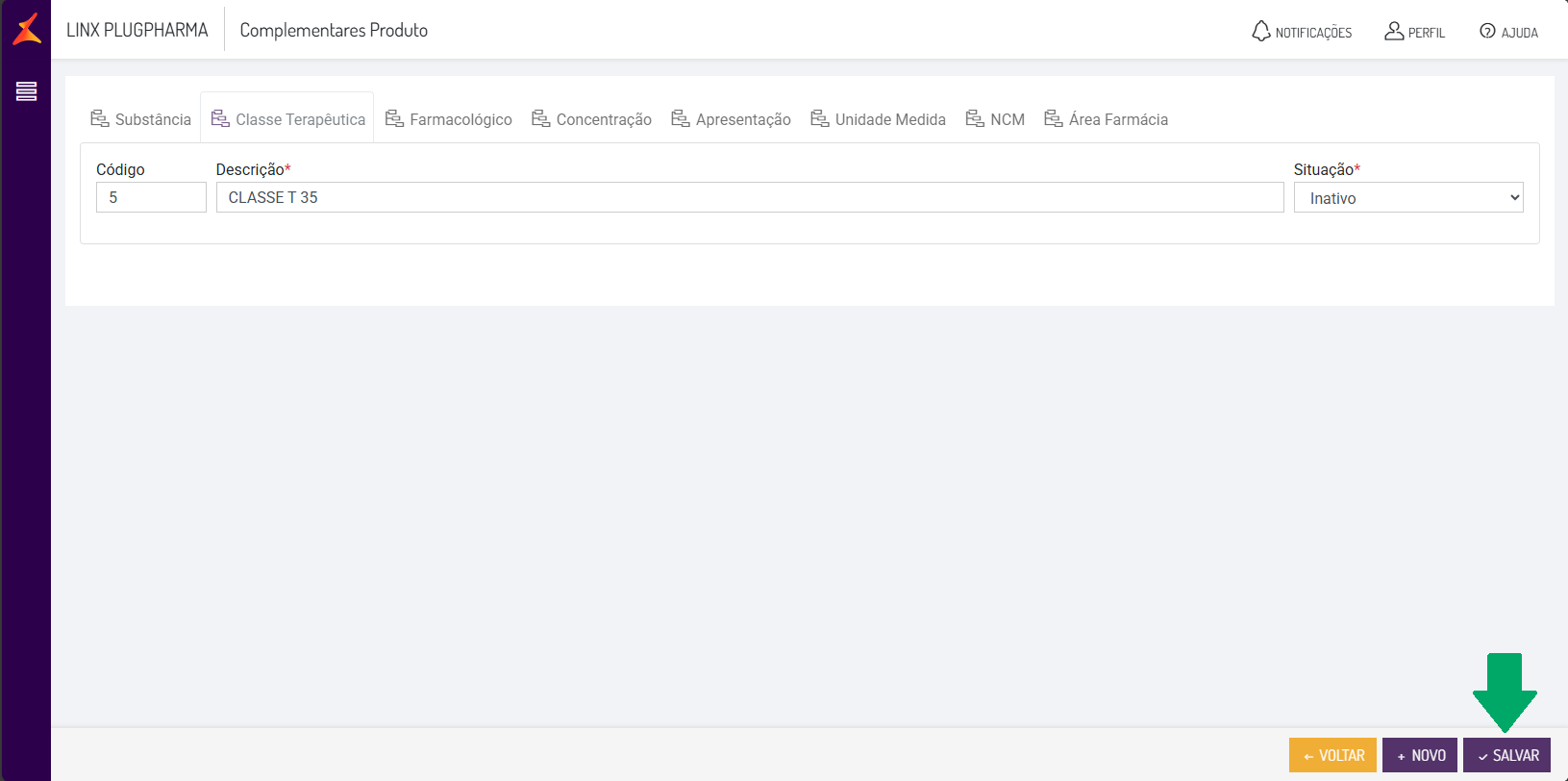 Importante: o cadastro complementares de produto, tem o objetivo de criar e editar a 'Classe Terapêutica' que está presente nos produtos.