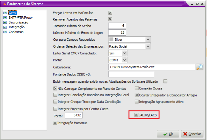 Parâmetro de sistema para ativação dos menus do LALUR/LACS
