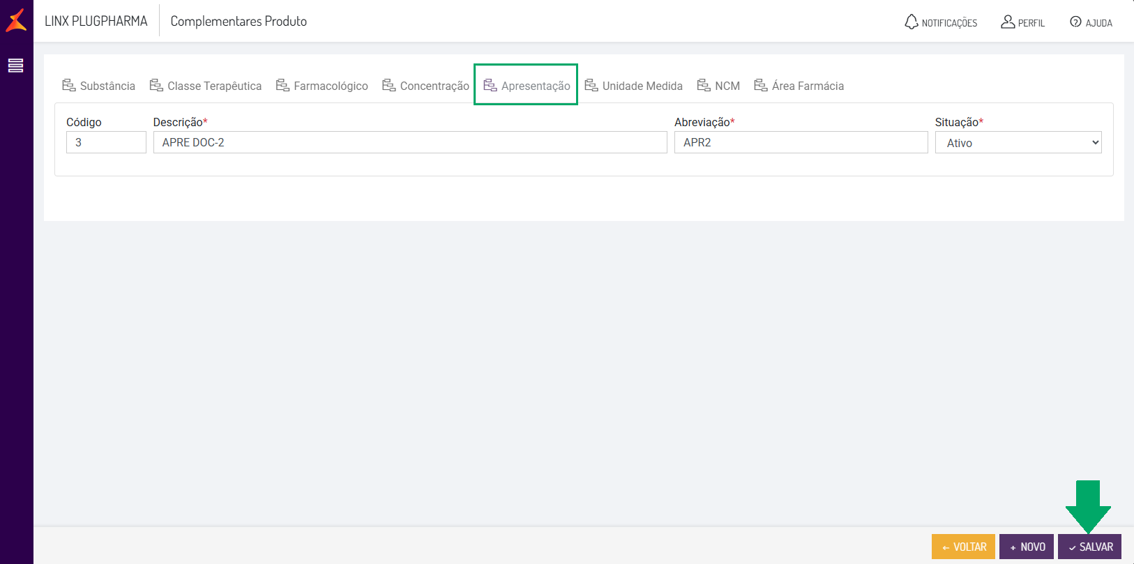 Para  consultar e editar as apresentações cadastradas nos dados complementares de um produto, siga os passos abaixo: