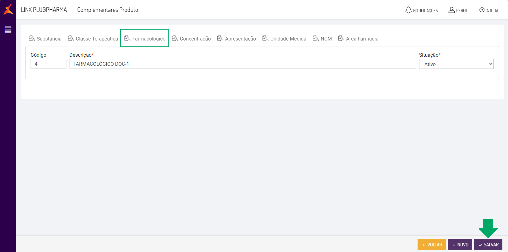 Importante: o cadastro complementares de produto, tem o objetivo de criar e editar a 'Farmacológicos' que está presente nos produtos.
