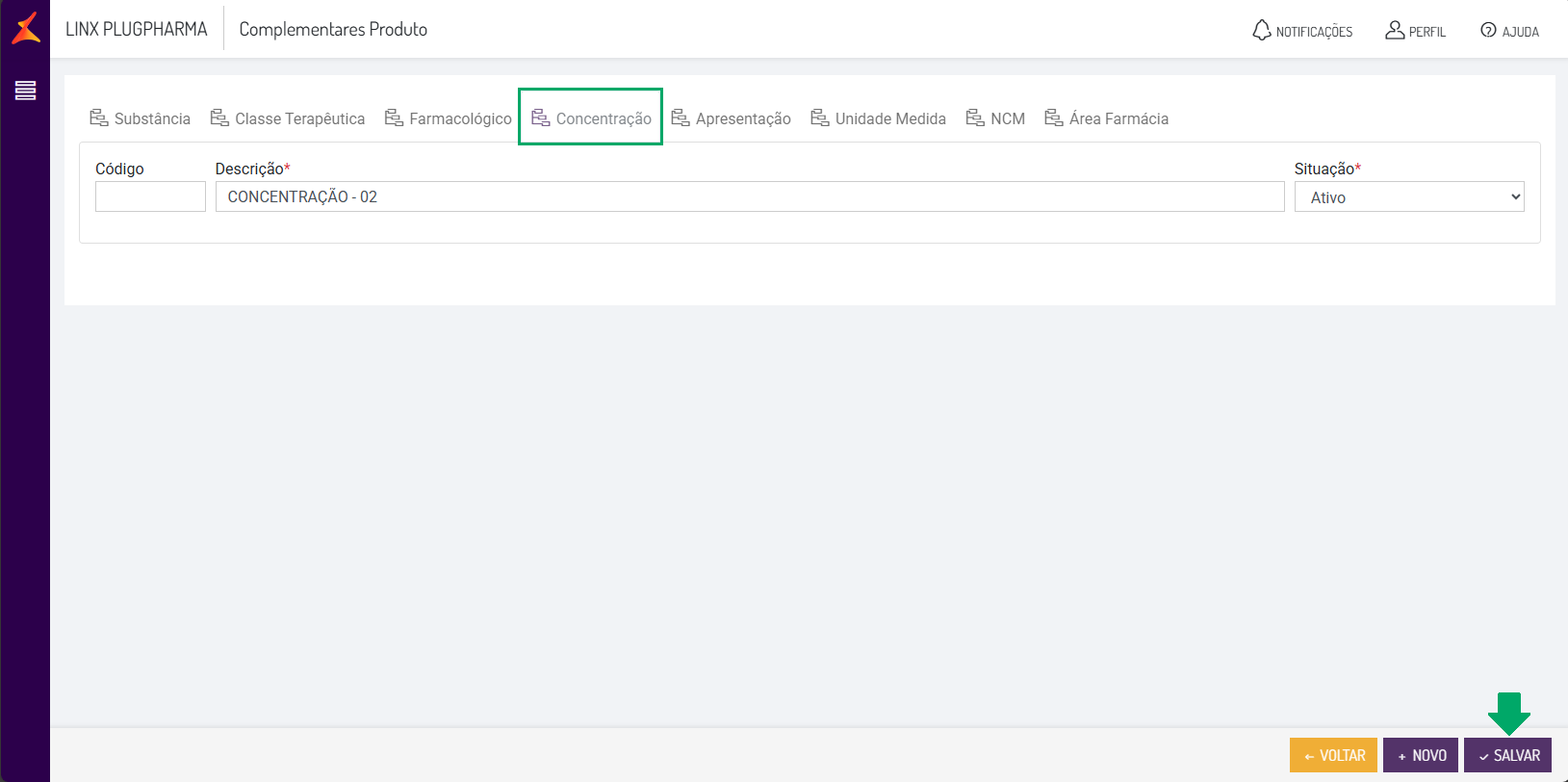 Para adicionar uma concentração nos dados complementares de produto, realize os passos a seguir: