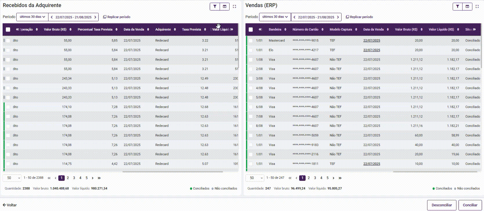 Irá abrir a tela com as informações dos valores recebidos das adquirentes e das vendas realizadas no ERP, na tela inicial ainda estão disponíveis as opções para Conciliar, Desconciliar, e outros recursos.