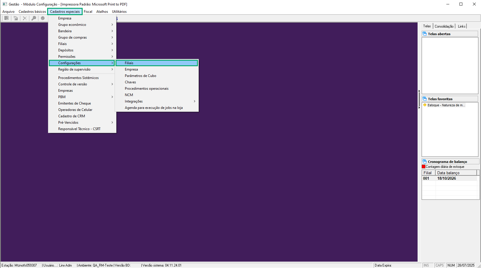 1. Para realizar a configuração do o código do IQVIA, acesse:  Módulo Configuração > Cadastros especiais > Configurações > Filiais