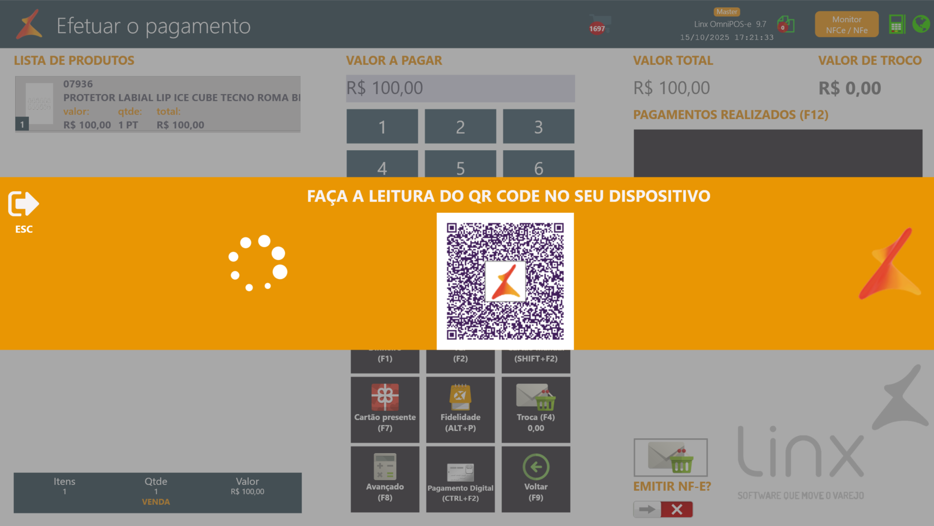 - O sistema exibirá o QR Code gerado para a venda em questão, assim o consumidor poderá efetuar a leitura com o seu smartphone. QR code será exibido no pinpad, e na tela (ao habilitar o parâmetro TEF_DIRECAO_QRCODE_EM_TELA);