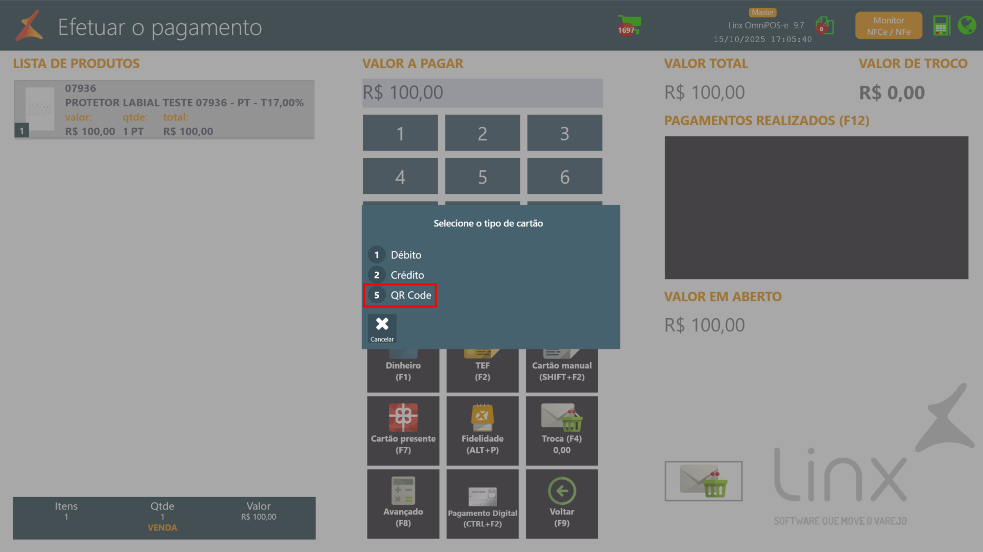 - Um pop-up se abrirá na tela do PDV com a opção QR Code;