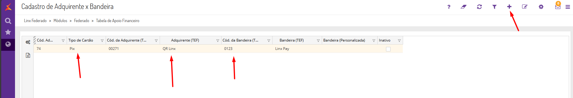 Ambiente Federado > Cadastro de Adquirente x Bandeira - Realizar o vínculo da adquirente com a bandeira, e definir o tipo de ambiente do cartão (PIX);