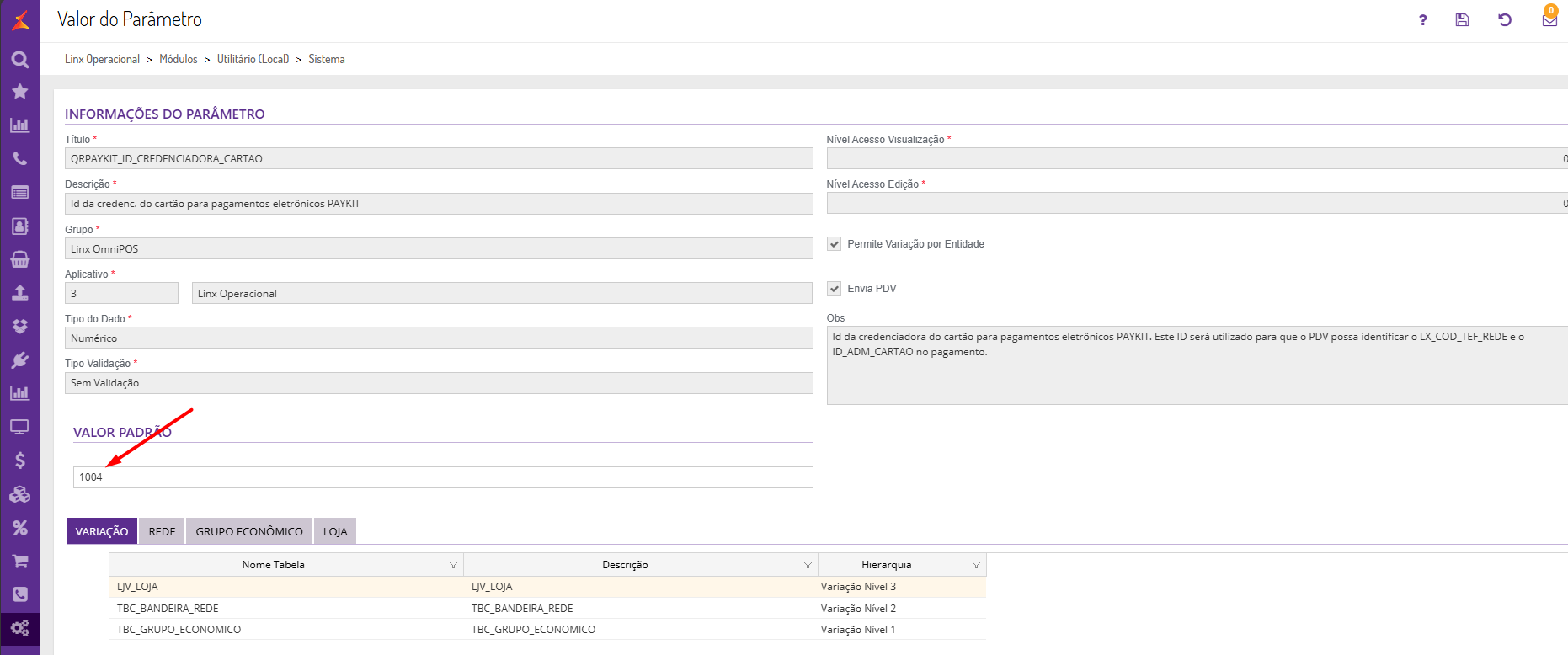 Ambiente Operacional > Valor do Parâmetro - Incluir o ID da credenciadora no parâmetro QRPAYKIT_ID_CREDENCIADORA_CARTAO