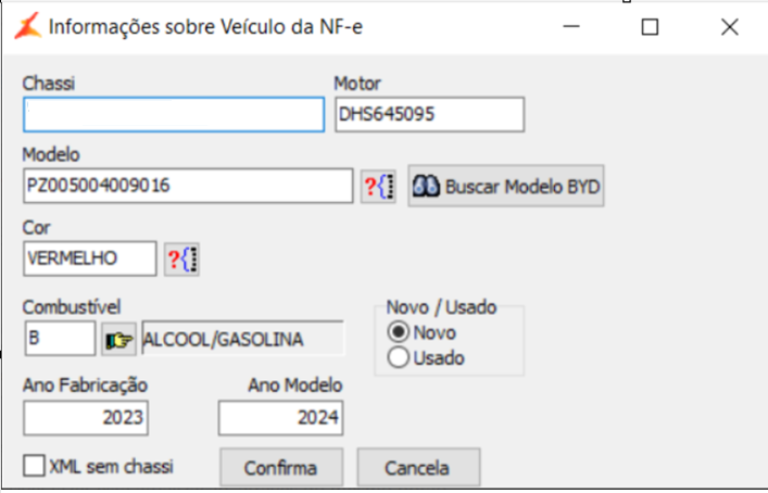 - Na nota de entrada do veículo, o modelo do veículo deve ser informado com o novo padrão de códigos de modelos da BYD (botão 'Buscar Modelo BYD')