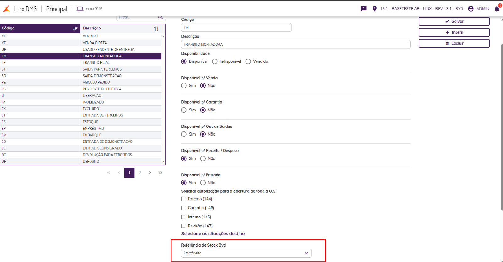 Necessário fazer a associação entre a situação do LinxDMS e a situação que será usada para envio dos veículos pela API. As situações possíveis são :