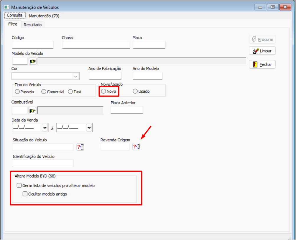 Marcar a opção Gerar Lista de veículos para alterar modelo (o usuário deve ter permissão para a função 68).