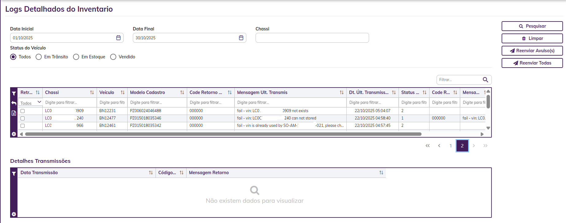 No menu Fabrica > BYD > Logs Detalhados Inventário, é possível verificar em detalhes a situação de cada veículo (chassi) .