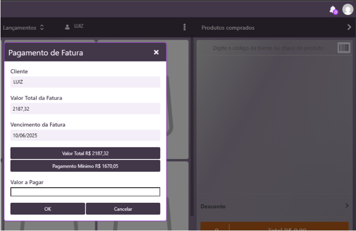 Neste caso, o sistema exibirá na tela o valor da parcela e o operador poderá digitar livremente o valor que o consumidor desejar pagar, mesmo que seja menor que o valor mínimo sugerido.
