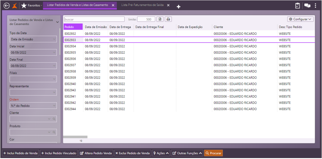 Inclusão de Pré-Faturamento de Pedido de Venda