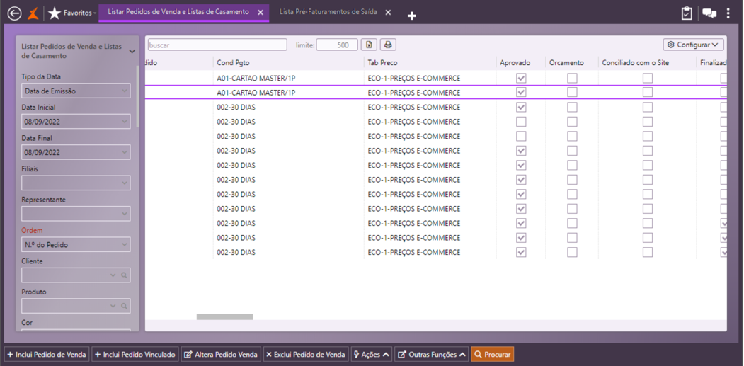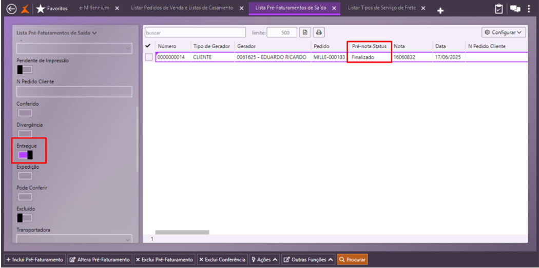 Uma nova consulta nos pré-faturamentos gerados mostrará que o status de pré-nota já foi atualizado. E ficará aguardando pela conferência e pelo faturamento.