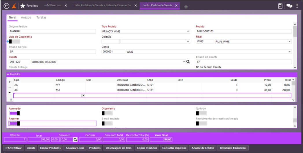 Geração de Pré-Nota na integração do pedido de venda no e-Millennium