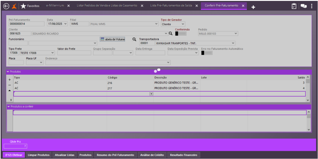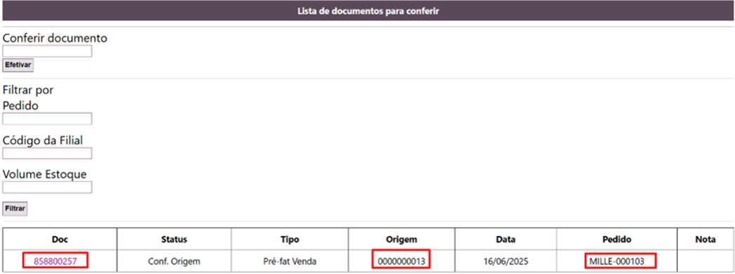 - Quando a plataforma retornar a etiqueta, que pode ser consultada através de uma tela já existente, o operador poderá realizar a conferência do pré-faturamento.