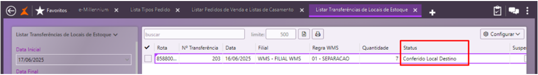 A conferência da transferência de local de estoque, poderá ser feita no e-Millennium ou pelo coletor de dados.