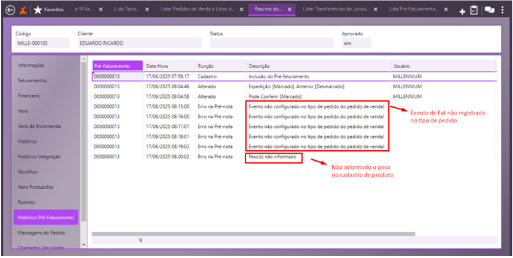 1 - Caso não seja emitida a pré-nota, é possível checar o problema no Histórico Pré-faturamento.
