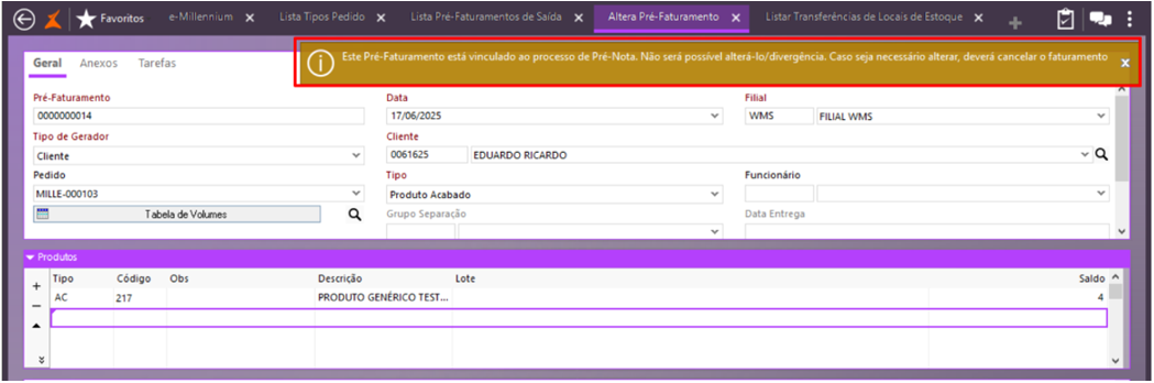 Atenção! No recurso de pré-nota, a baixa do estoque não será realizada na inclusão da movimentação. Os itens sairão do estoque na efetivação da conferência do pré-faturamento.