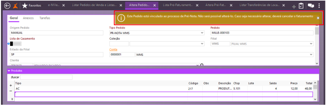 2 - Mensagens de alerta que serão exibidas se o usuário tentar fazer alterações nos pré-faturamentos ou nos pedidos que estiverem vinculados ao processo de pré-nota.