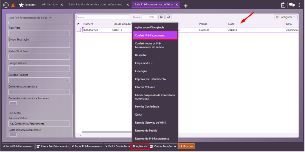 Em Logística\Expedição\Pré-faturamento de Saída, faça uma busca e selecione o pré-faturamento a ser conferido. No link Ações, selecione a opção Conferir Pré-Faturamento e observe que o número da nota fiscal já está sendo exibido antes da conferência ser realizada, isso só é possível porque estamos usando o recurso da pré-nota.