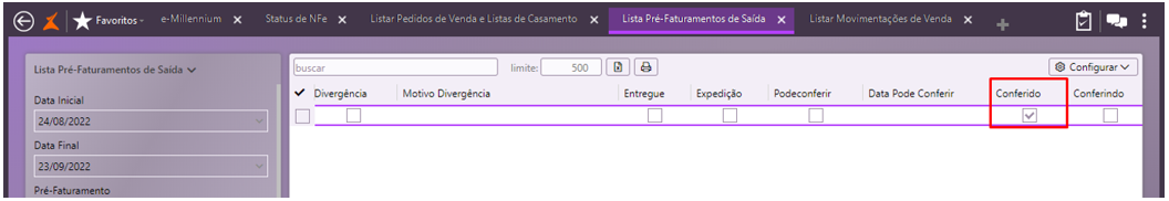 a) Configurações Gerais\Logística\Pré-Faturamento de Saídas, na guia Conferência: